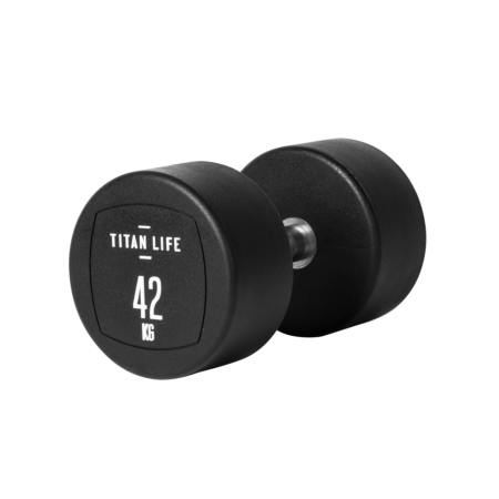 TITAN LIFE PRO Dumbbell 42 kg er en håndvægt lavet i kommerciel kvalitet, som er meget behagelig at holde ved og kan bruges til træning af hele kroppen. Du har mulighed for at vælge mellem vores brede sortiment som går fra 2 kg. til 60 kg. (kun lige tal). Vores håndvægte er svejset sammen med et buet håndtag, som giver et optimalt greb og som er stabile, så de ikke går løs under træning. Disse håndvægte kommer i et unikt design med PU betræk på vægtenheden. Det tykke gummilag sikrer lavt støjniveau, samt beskytter dit gulv.